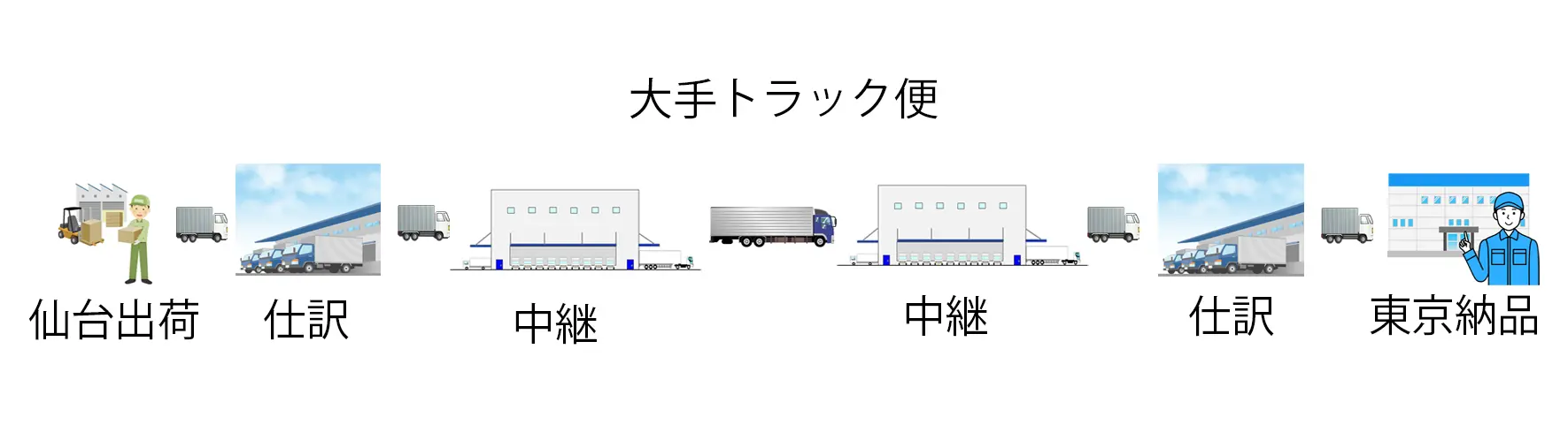 宅配便など一般的なトラック輸送では、沢山の荷物を混載してコストを下げる仕組みです。