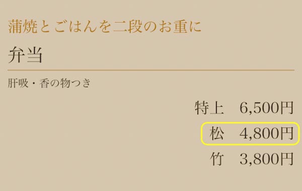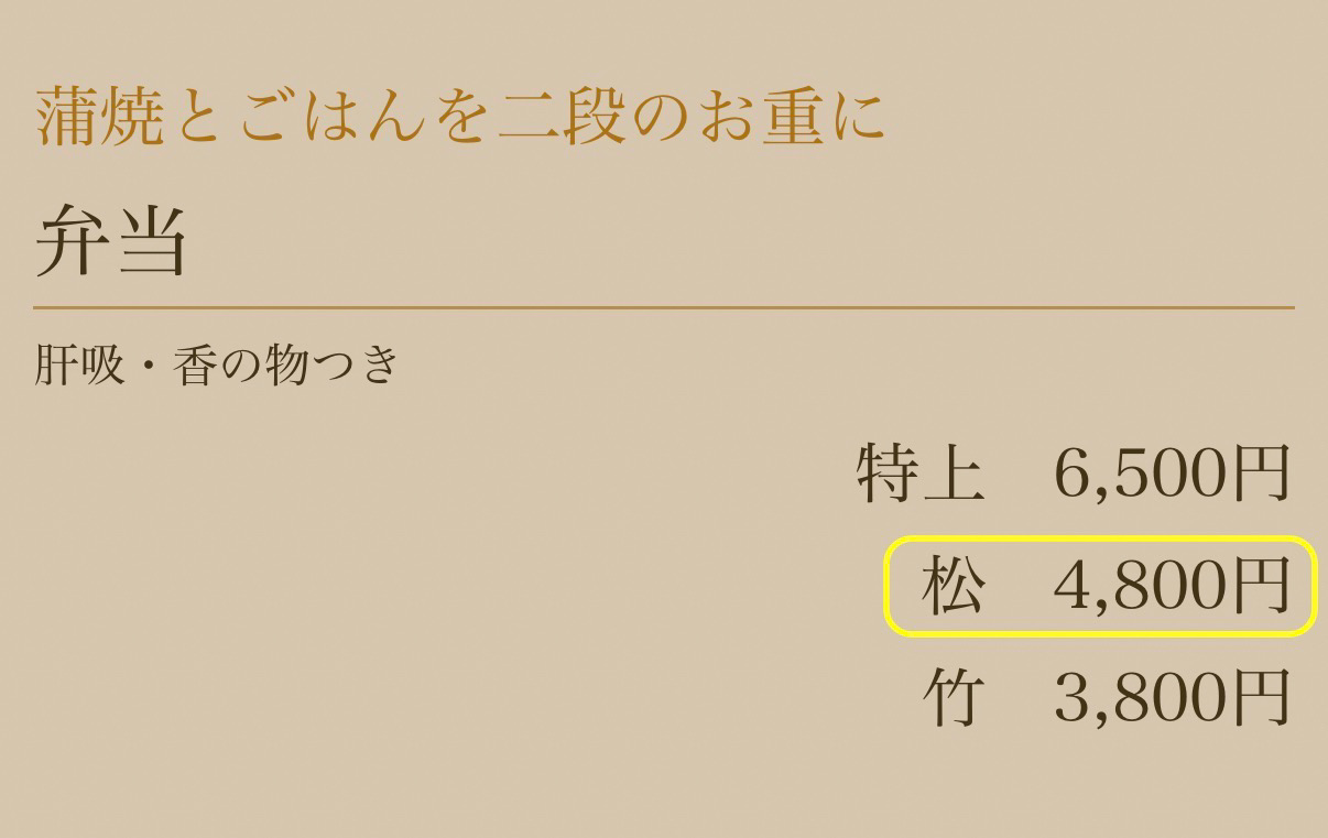 蒲焼がご飯に乗ってない分割された弁当の松です。私の印象は鰻のふっくら感は仙台で1番な気がしますが、鰻は高いから頻繁に食べ比べる事は出来ませんので、その時々の鰻の違いとか私の体調などにもよる良い加減な感想です。とにかく大変おいしい鰻弁当です。