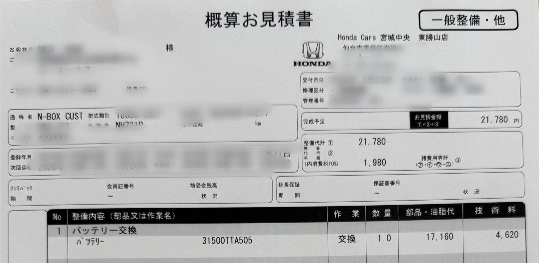 バッテリー交換だけではなく、私はディーラー整備士さんに依頼する品目が大半です。